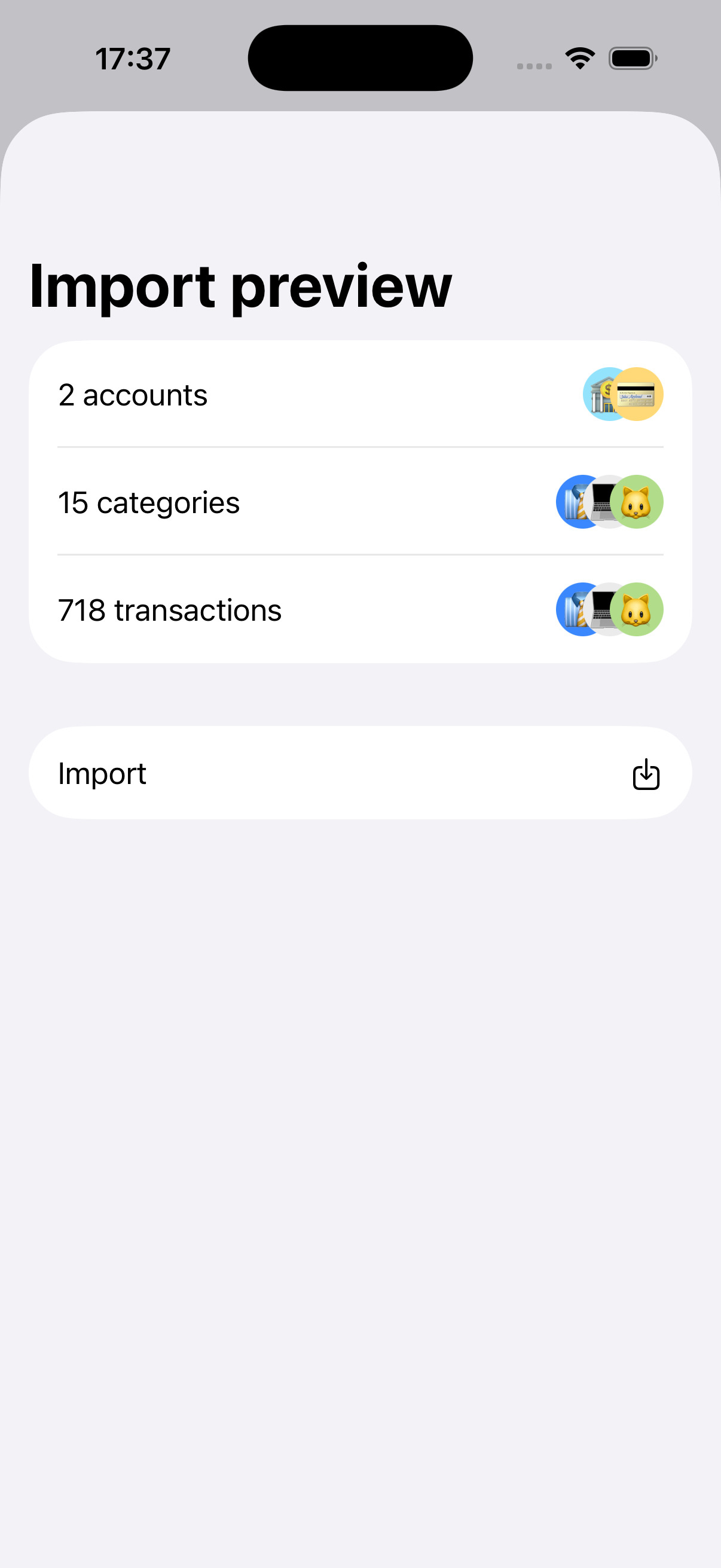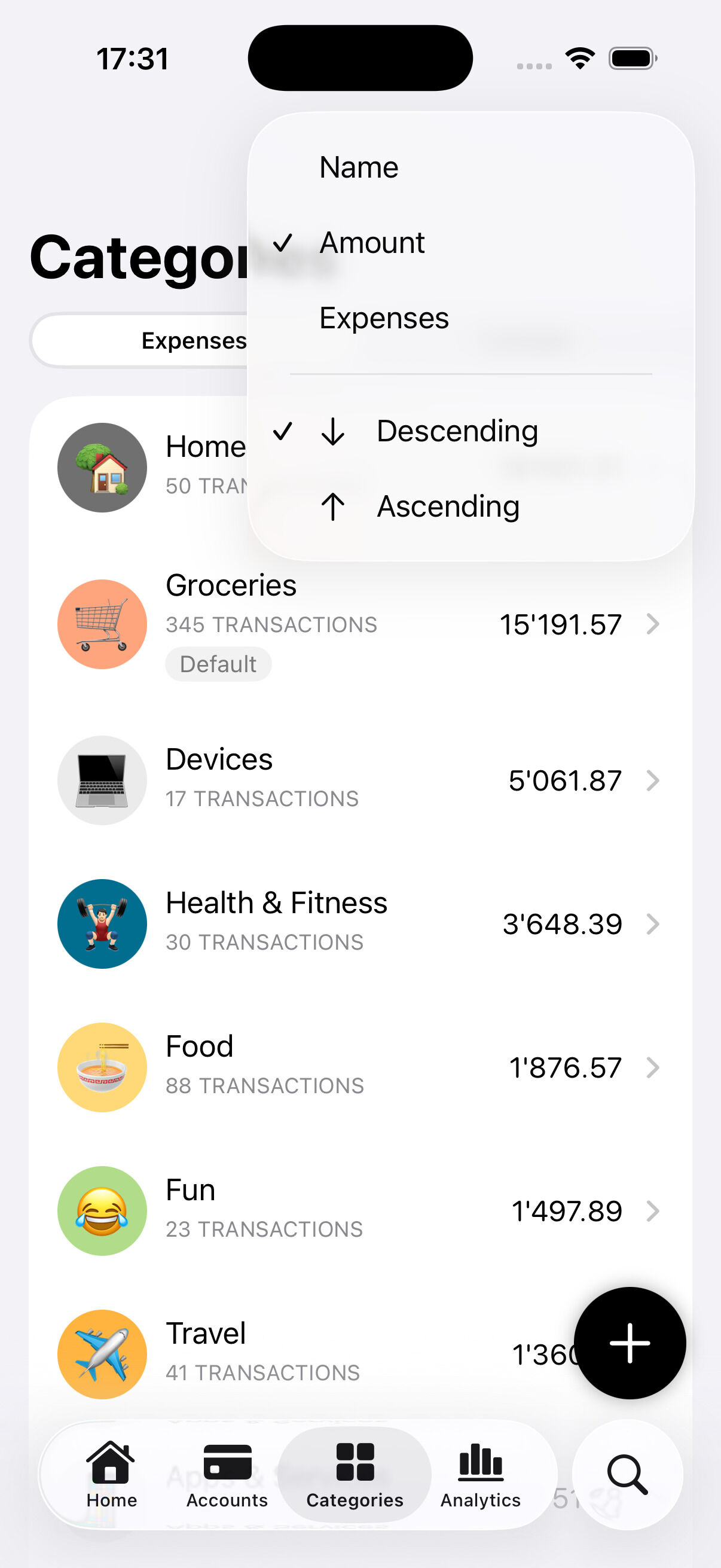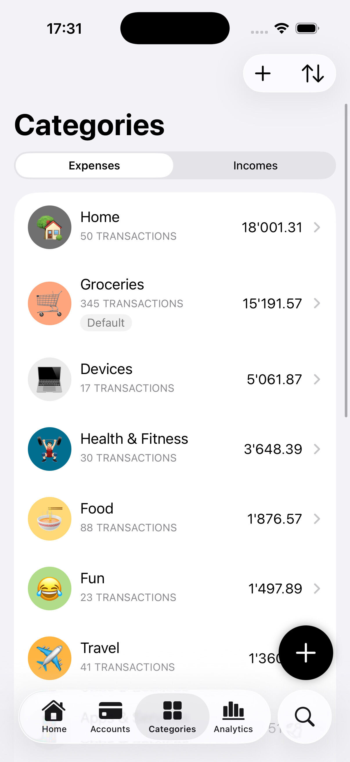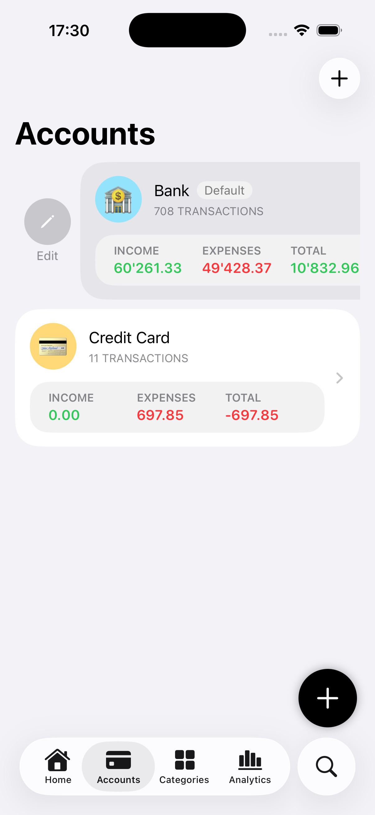 Organize your finance your way! Create accounts and categories and customize them with colors and emojis.