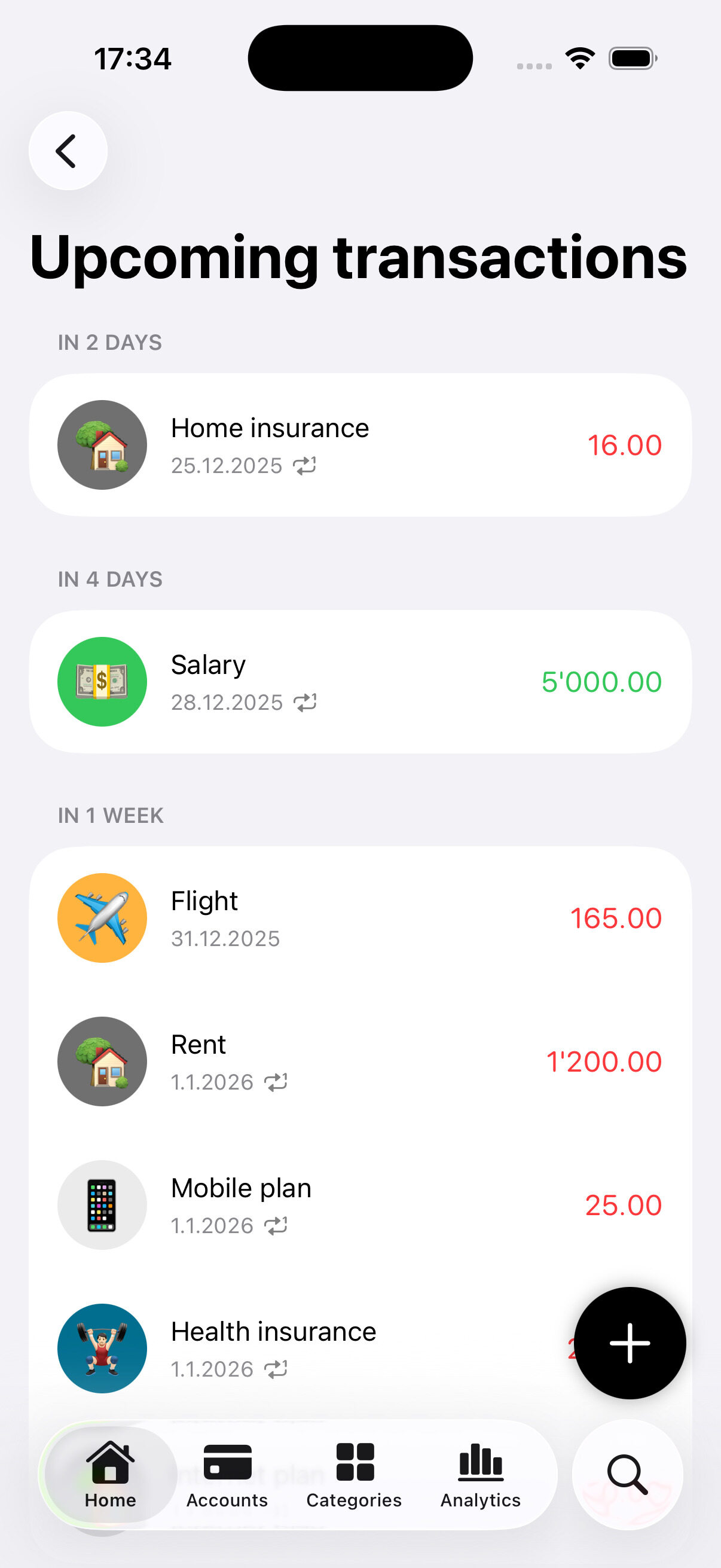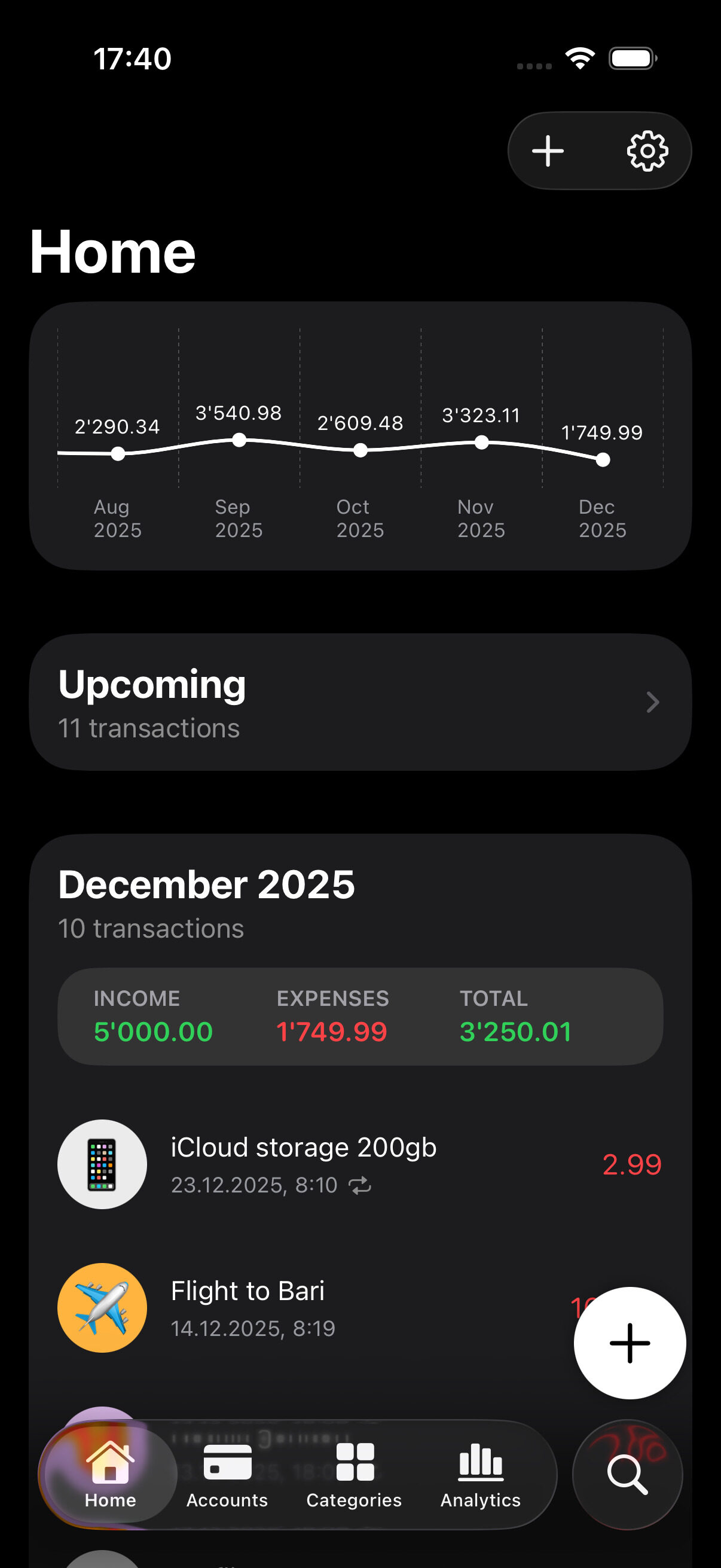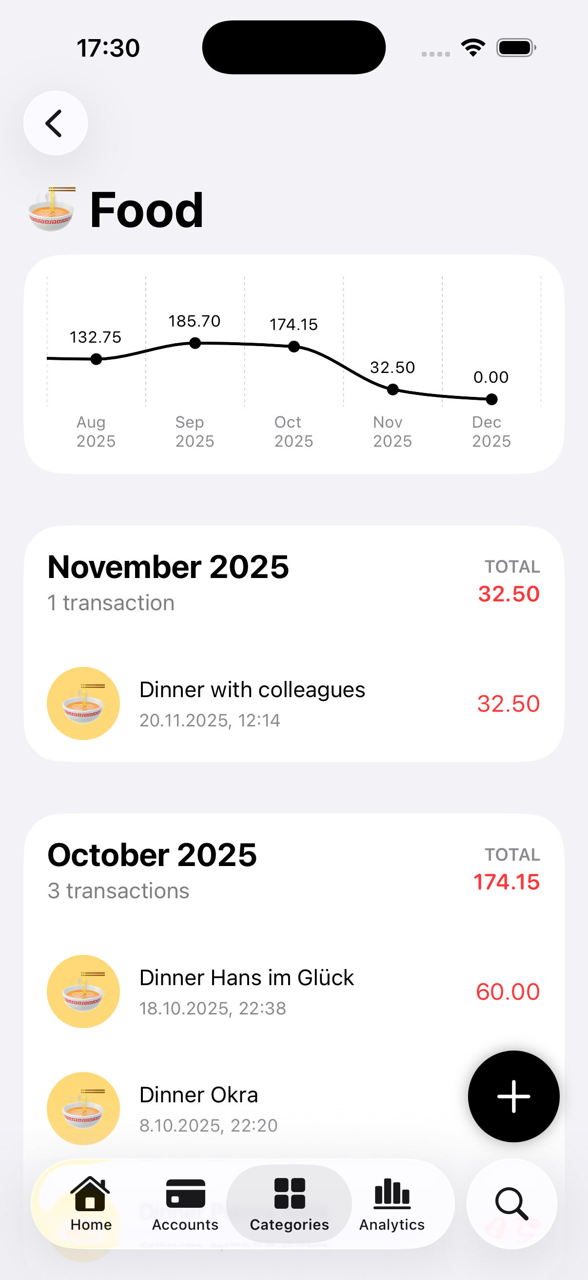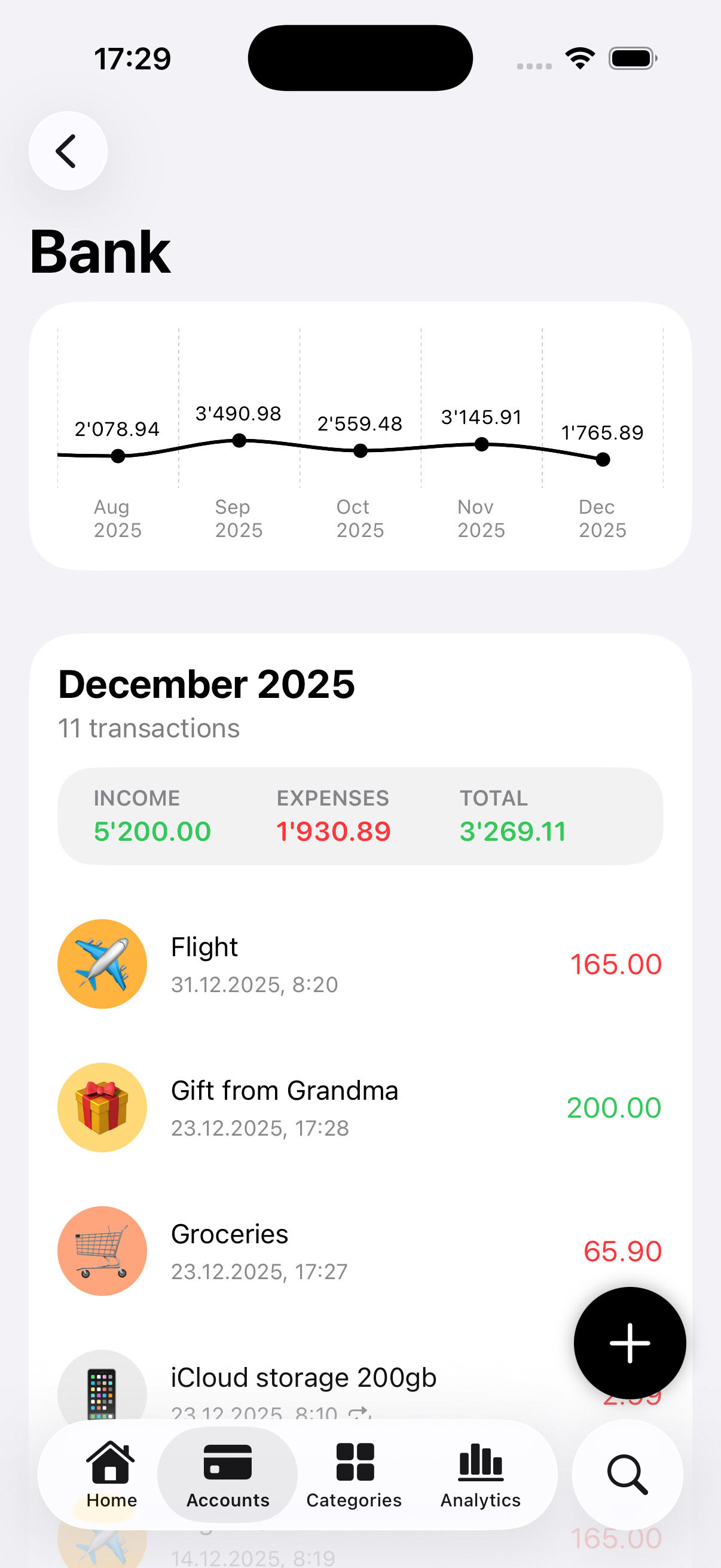 Organize your finance your way! Create accounts and categories and customize them with colors and emojis.
