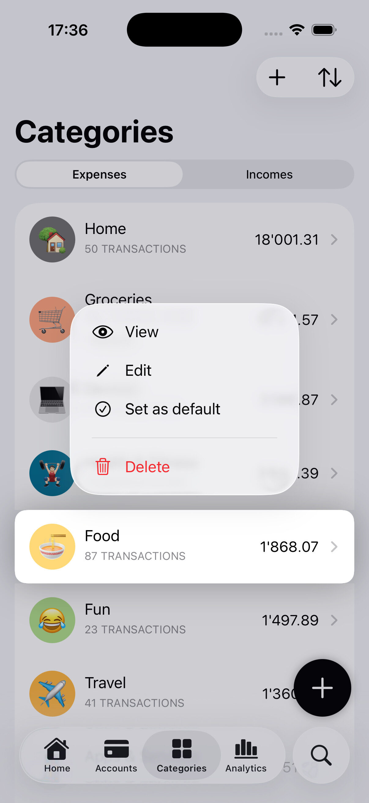 Use swipe actions and context menus to edit, delete, or set defaults for accounts, categories, and transactions.
